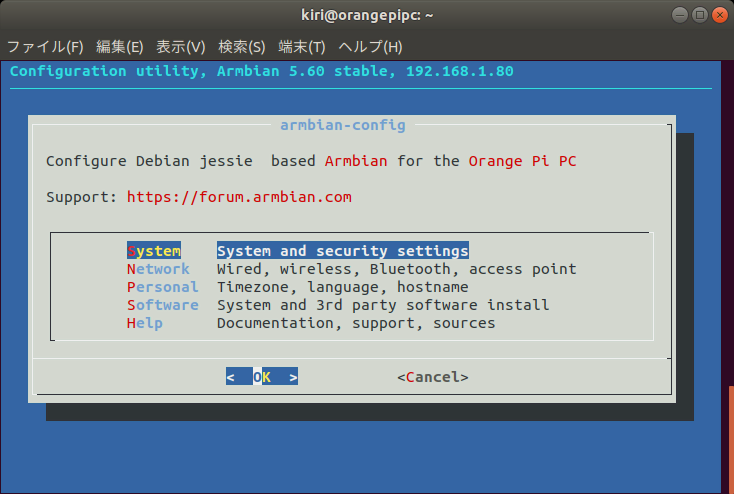 では早速armbian-configをインストールします。インストールはaptから行えます。完了したらあとはsudoで実行するだけです。
