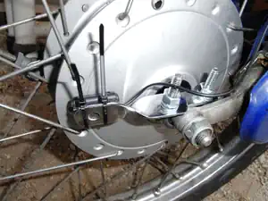 本当はブッシュをU字金具で締め付ける形にしたかったのですが、ドラム側に寄せすぎると金具が接触しそうだったのでブッシュとフォークとの間に出来る窪みに引っ掛かる形にしました。ここであれば何か物が当たってもU字金具そのものはズレません。ひねり金具は動くと思うのでゴムか何か滑り止めを入れたほうがいいかも。